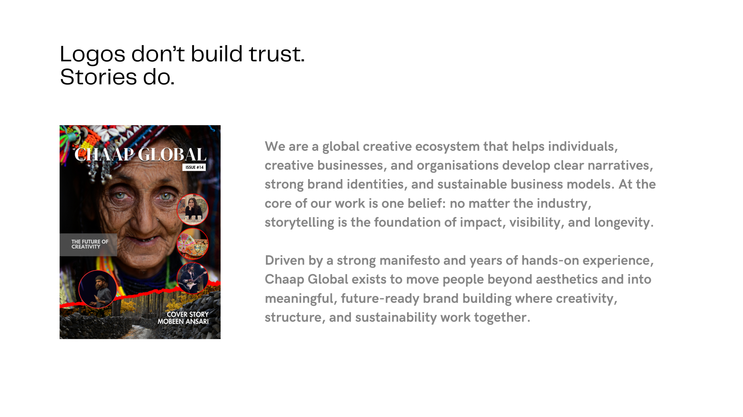 We are a global creative ecosystem that helps individuals, creative businesses, and organisations develop clear narratives, strong brand identities, and sustainable business models. At the core of our work is one belief: no matter the industry, storytelling is the foundation of impact, visibility, and longevity.